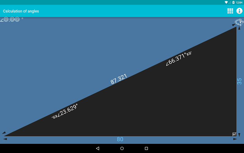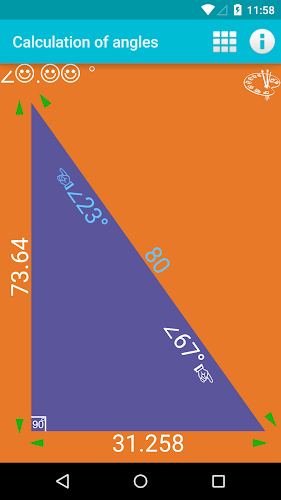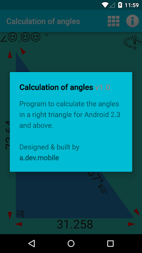 Program pro výpočet úhlů, zatímco pouze v pravoúhlého trojúhelníku. Uživatelsky přívětivé menu entry, schopnost měnit aplikací na pozadí a konvektor desítkové úhly v minutách a sekundách.V Současné Době Nabízíme Verzi 1.0. Toto Je Naše Nejnovější, Nejvíce Optimalizovaná Verze. Je Vhodný Pro Mnoho Různých Zařízení. Zdarma Ke Stažení Přímo Apk Z Obchodu Google Play Nebo Jiných Verzí, Které Hostujeme. Kromě Toho Si Můžete Stáhnout Bez Registrace A Bez Nutnosti Přihlášení.