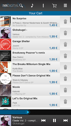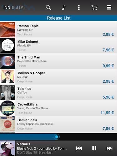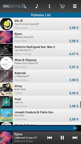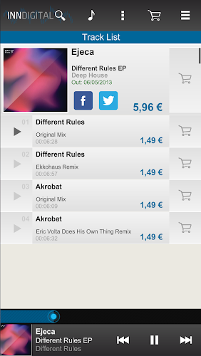 Inndigital Music Store. Vytvořeno pro DJs! Přístup k digitální hudbě z Inndigital na vašem zařízení smartphone/tablet s touto aplikací.Procházejte, poslouchejte a přidejte hudbu do svého košíku odkudkoli, usnadňují nákupy z aplikace nebo online webu. Vše, co potřebujete, je inndigital účet.