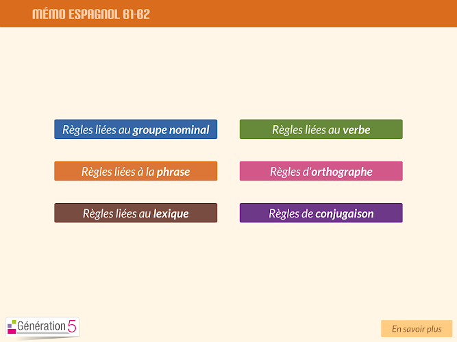 Tato aplikace nabízí interaktivní cvičení ke kontrole a upevnění vašich znalostí španělštiny.Doplňuje brožuru španělštiny B1-B2 Memo určenou pro studenty středních škol, která představuje základní pravidla a koncepty, které je třeba znát při zvládnutí španělského jazyka.