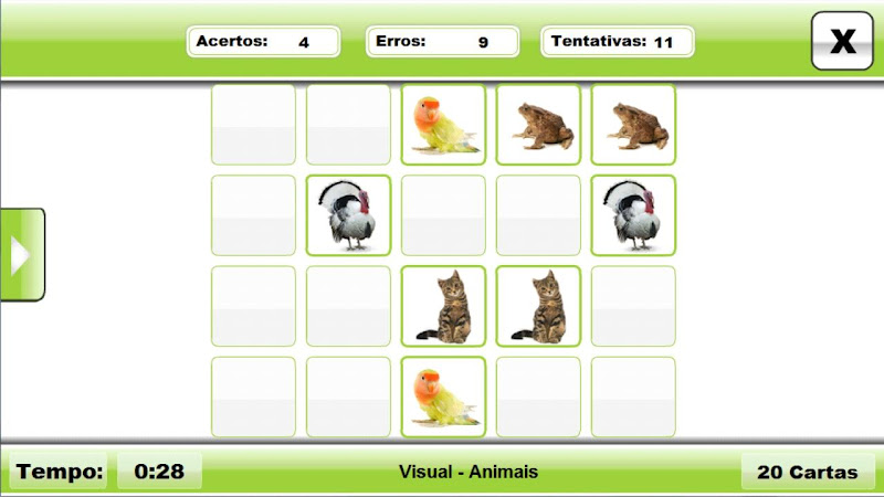 Memorialing - paměťová hra se sluchovými a vizuálními podněty kombinuje operativní trénink paměti s fonologickými dovednostmi, diskriminací na sluchu, asociaci neverbálních podnětů, usnadňující procesy učení. Vizuální.Kategorie, která tvoří hru ve verzi Lite, je: