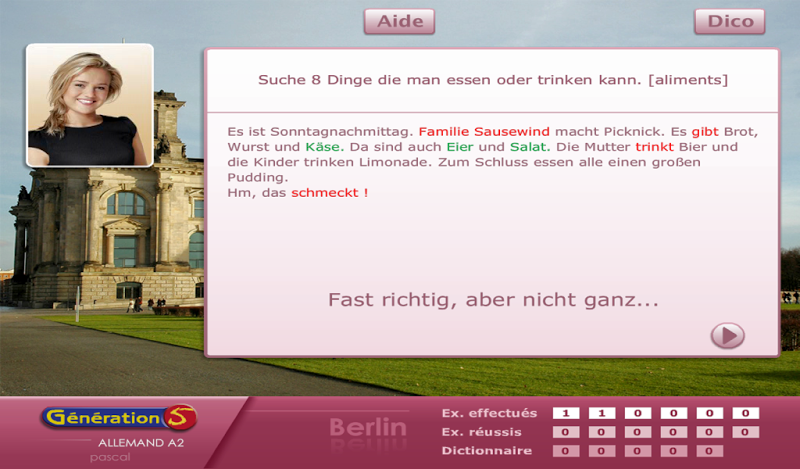 různé interaktivní aktivity – cvičení na doplnění prázdného místa a cvičení s výběrem z více odpovědí, rekonstrukce dialogů, křížovky, rozpoznání chyb atd. – jsou zaměřeny zejména na obohacení slovní zásoby a osvojení četných gramatických bodů. studenti se zabývají syntaktickými pojmy, jako je organizace věty (místo konjugovaného slovesa, negace, koordinace, podřazení atd.), sloveso (jednoduché sloveso, slovesná fráze, modální slovesa, časy a způsoby atd.), jmenná skupina (struktura, rod a číslo, determinanty, pády atd.), zájmena, přídavná jména, adverb atd.