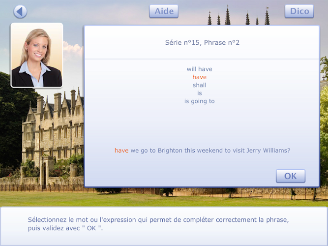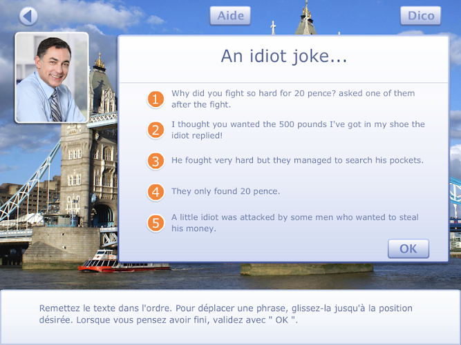 Tato aplikace, která je zaměřena na studenty středních škol (4./3. v lv1; revize na střední škole), nabízí aktivity pro porozumění psané angličtině. lze jej použít ve třídě, ale také doma, kde bude cenným nástrojem pro učení a opakování základních pojmů.nabízí „výlet“ do různých měst v Anglii: Londýn, Cambridge, Oxford, Brighton, Edinburgh a Newcastle. každá etapa odpovídá typu činnosti a bude příležitostí k řešení mnoha kulturních témat: každodenního života a životního prostředí, kulturního a historického dědictví, zeměpisných památek a reálií, literárního a uměleckého dědictví.