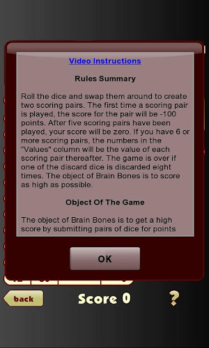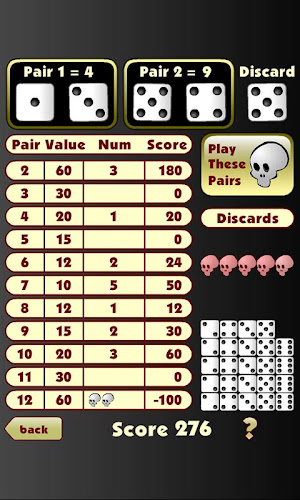 Zpočátku se hra zdá jako jednoduchý "nedělají špatné role" druh hry. Ale ther je víc než to. Je třeba pečlivě řídit vyřazených kostky, stejně jako páry, které můžete provést. Zdá se, že trochu frustrující na první pohled, protože nikdy nemůžete Zdá se, že si pozitivní skóre. Ale s trochou plánování, můžete to udělat.Vaše první bodování dvojice předvolá lebky. Pozdější páry vymaže je. Řádky s lebkami stojí -100 bodů. Jakmile lebky jsou vymazány, můžete začít kladná čísla. Hodně štěstí!