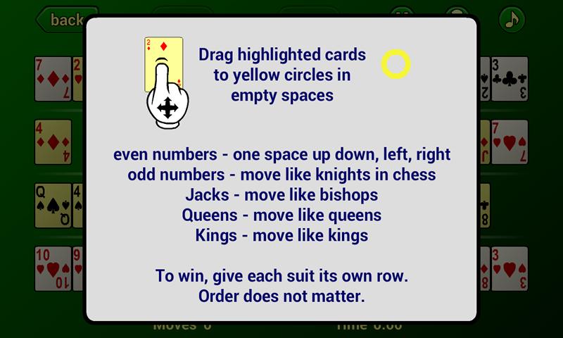 Zde je chytrá maličkost karetní hra Solitaire. Funguje to trochu jako puzzle s posuvnými dlaždicemi, ale hrací karta „kousky“ se nejen pohybují ve čtyřech směrech. Karty se pohybují jako šachové kousky, v závislosti na jejich hodnotách. Pokuste se uspořádat balíček co nejméně pohybů. Při hraní se naučíte nové strategie. Pro vás také bude těžké zastavit, protože hra je překvapivě návyková. Toto je další jednoduchá, ale velmi nevyzpytatelná, malá mobilní hádanka z kódové zóny.Co Je Nového