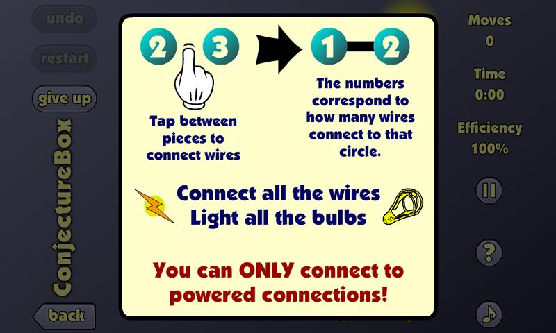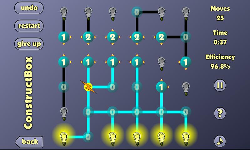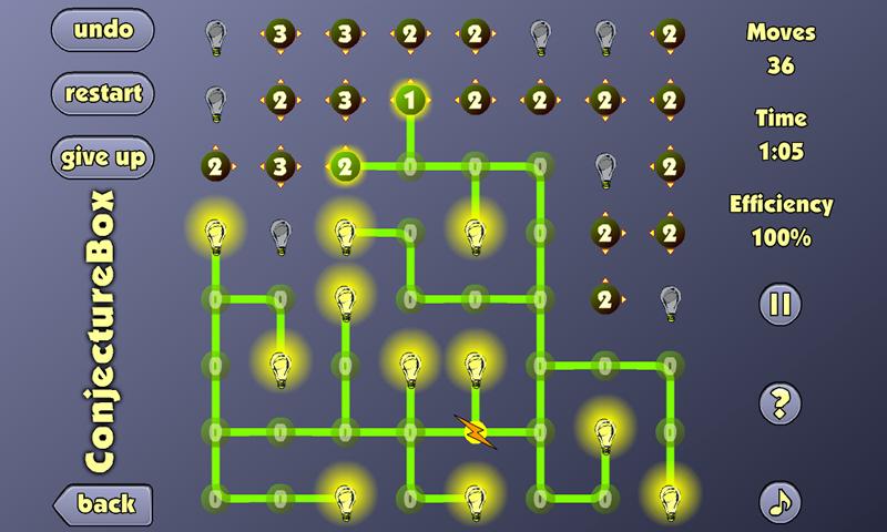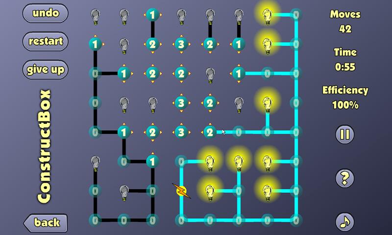 V duchu dalších her, které se připojují k drátům, přichází skvělá malá skandálová hra "postavte obvod". Objekt je jednoduchý - připojte všechny kabely a rozsvítíte všechna světla. Světla a zdroj energie jsou na místě, ale musíte zjistit, jak umístit vodiče. V očíslovaných kruzích máte spoustu stop, ale trochu si to pomyslí, abyste je dostali na správném místě. Umístění zjevných drátů vám často poskytne stopy, jak umístit kabely jinde, ale občas budete muset mít šanci.A jakmile budete mít povědomí o ConstructBoxu, můžete přehrát variantu "ConjectureBox", která je podobná, ale umožňuje pouze připojení k buňkám, které jsou napájené. Není to jen záležitost propojení zjevných drátů. Budete potřebovat trochu více plánování, než to vyřešíte.