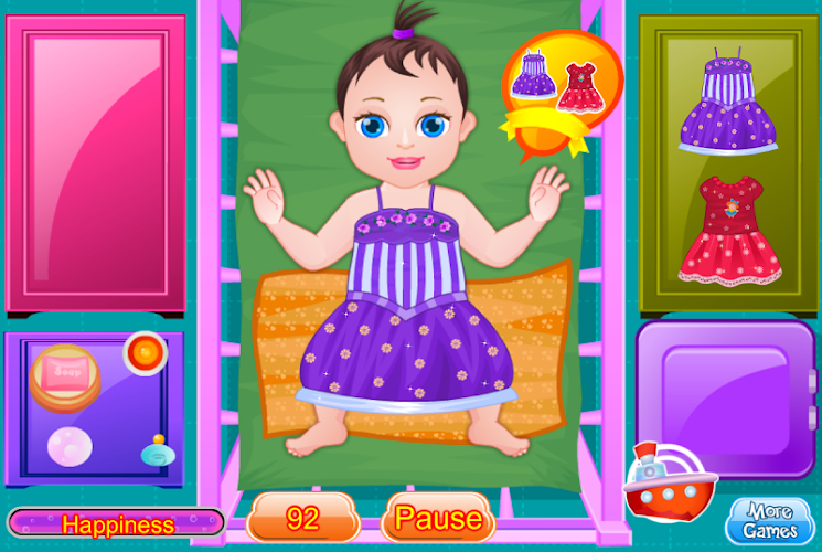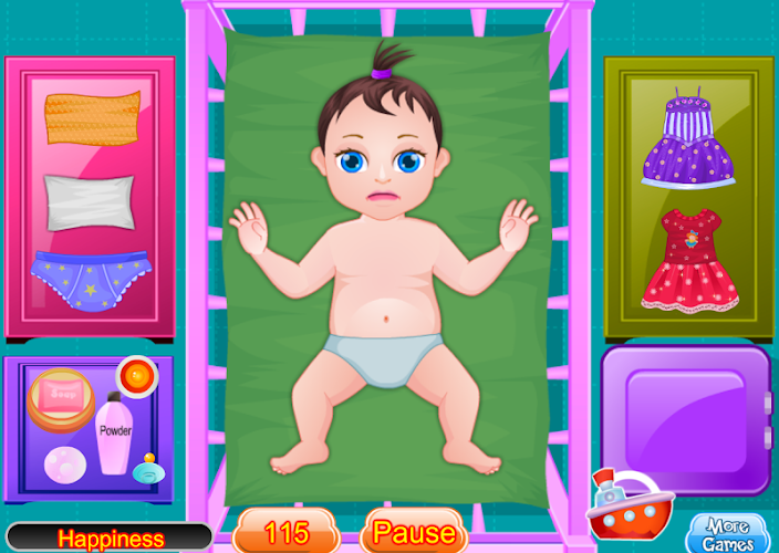 Musíte jít navštívit naše drahé přátele. Jakmile jsme v tom, šli jsme se podívat, co dělá jejich dítě, všiml jsem si, že dítě potřebuje naši pozornost a chce si hrát s hračkami, které má ve svém pokoji, vlak, letadlo, fanoušek míče, pak chce pít mléko a chodit s vaším nákupní košík . Budete muset udělat vše, co si přeje, aby neplakal a byl šťastný. V závislosti na tom, jak rychle mu dáte to, co chce, na konci každé úrovně uvidíte uspokojení komunity Bebe. Poté, co Papat naše dítě začne spát, a my půjdeme do jeho postele, ale před oznámením o spánku, které musí změnit jeho plenu, protože ho udělal. Musíte hodit plenu do koše a musíte ji umýt a položit novou plenu na své malé dítě. Půjdeme s dítětem do koupelny a necháme vodu ve vaně a my dáme hračky, které chce, kachňata, my se umýváme mýdlem pro děti, vyčistíme sladkou vodu, po které budeme uděláme Smazat koupelnu ručníky. Nakonec vidíme uspokojení dítěte na všech úrovních.Po umytí a čištění budete muset své dítě prášek, abyste mu dali novou plenu, a vyberte si, jaké oblečení bude oříznuté, abychom si mohli vybrat mezi červenou nebo fialovou. Bavte se.