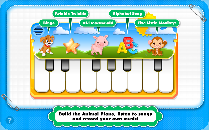 Hrát na klavír. Nahrajte svou hudbu. Poslechněte si klasické dětské melodie, včetně Old MacDonald, Twinkle Twinkle, Bingo, Five Little Monkeys a Alphabet Song.