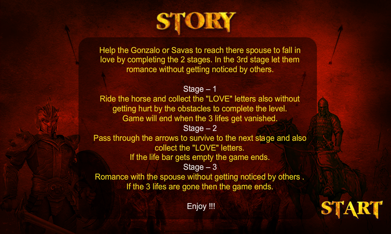pomozte válečníkovi gonzalo nebo savas dostat se k manželovi, aby se zamiloval tím, že dokončíte 2 etapy [koňské dostihy] [padají šípy] . ve 3. fázi jim nechte romantiku, aniž by si toho všimli ostatní.