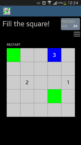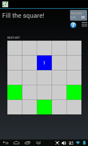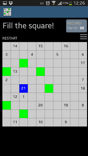 Naplňte čtverec! je jednoduchá logická hra. Klepněte na moudře další místo zdarma (zelené), dokud nenaplníte celý čtverec. Pravidla jsou velmi jednoduchá: můžete se pohybovat horizontálně a svisle skákat 2 čtverce, diagonálně skákat 1 čtverec. Na každém otočení jsou „legální“ čtverce natřeny zeleně. Vyberte si moudře mezi nimi, abyste vyplnili čtverec.5x5 Easy režim je vždy povolen. Dokončete jej a odemkněte 6x6. Modes Champion Mode (10x10) je odemčen dokončením 6x6
