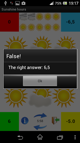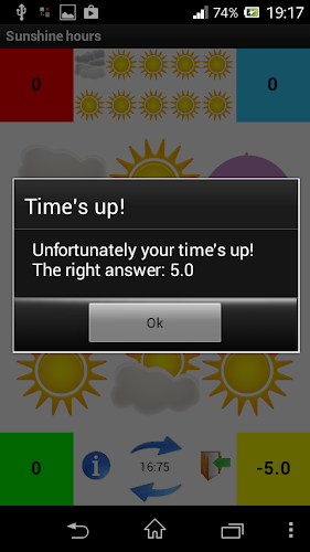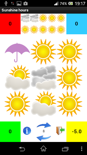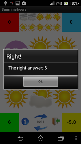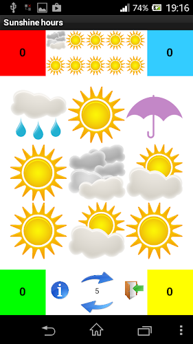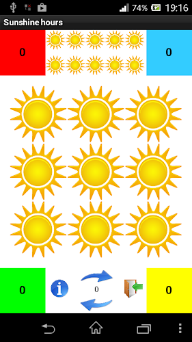 Sunshine Hours je matematická hra pro více hráčů pro 1-4 hráče. Po spuštění nového kola (generování nového nastavení) prvního hráče, který zná odpověď, by měl kliknout na jeho/hew Color Corner a vybrat odpověď do 5 sekund. V případě správné odpovědi se body hráče zvýší, v případě falešné odpovědi se body hráče sníží se správnými hodinami slunečního svitu.bavte se.