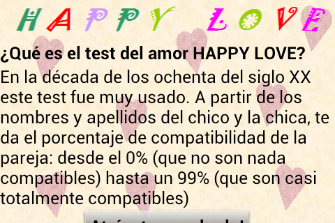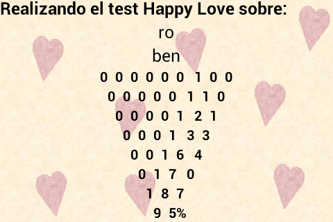 Test Happy Love Test je zábavný způsob, jak vidět kompatibilitu mezi dvěma personas.muy používanými v 80. letech dvacátého století a nyní dnes nám dává procentuální kompatibilitu, že pár dělá řadu matematických operacíz jejich jmen