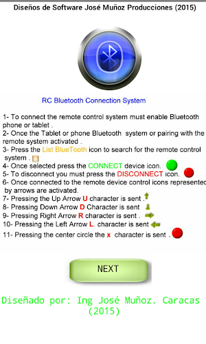 rc systém připojení bluetooth 1- pro připojení systému dálkového ovládání musí být povolen telefon nebo tablet bluetooth. 2- jakmile je aktivován systém Bluetooth tabletu nebo telefonu nebo spárování se vzdáleným systémem. 3- stisknutím ikony seznamu bluetooth vyhledejte systém dálkového ovládání. 4- po výběru stiskněte ikonu připojit zařízení. 5- pro odpojení musíte stisknout ikonu odpojení. 6- po připojení k ovládání vzdáleného zařízení se aktivují ikony reprezentované šipkami. 7- stisknutím šipky nahoru se odešle znak u . 8- stisknutím šipky dolů d se odešle znak . 9- stisknutí pravé šipky r znak je odeslán. 10- stisknutím levé šipky l. znak je odeslán 11- stisknutím středového kruhu se znak x odešle.V Současné Době Nabízíme Verzi 1.1. Toto Je Naše Nejnovější, Nejvíce Optimalizovaná Verze. Je Vhodný Pro Mnoho Různých Zařízení. Zdarma Ke Stažení Přímo Apk Z Obchodu Google Play Nebo Jiných Verzí, Které Hostujeme. Kromě Toho Si Můžete Stáhnout Bez Registrace A Bez Nutnosti Přihlášení.