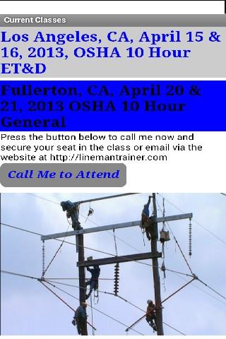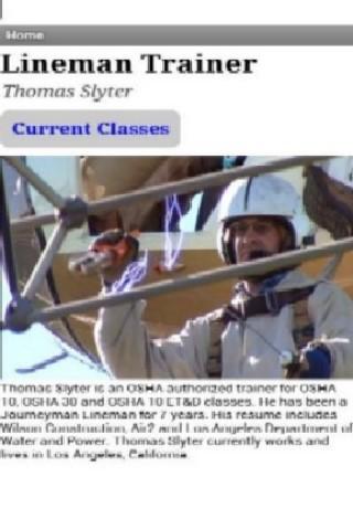 This app provides updated information and schedules for OSHA 10, OSHA 30 and OSHA 10 ET&D classes instructed by OSHA authorized outreach trainer Thomas Slyter.Thomas Slyter has been a Journeyman Lineman for 7 years. His resume includes Wilson Construction, Air2 and Los Angeles Department of Water and Power. He currently works and lives in Los Angeles, California.