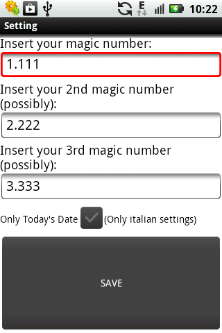 Každý maličký kouzelník ví, že x = x+0*a/b, kde x je „předpověď“ a a, b čísla nedbale vybraná. Jedná se o standardní kalkulačku, ale jednoduché kliknutí na „%“ (režim změny) a pokaždé, když kliknete na „=“, zobrazí se vaše předpověď. Longclick na „%“ pro nastavení vašich předpovědí můžete nastavit maximálně 3 předpovědi (pokaždé, když kliknete na „=“ změnu predikce) nebo skutečné datum, jako je předpověď (v tomto případě pouze italské nastavení na vašem zařízení).pouze pro kouzelníky.
