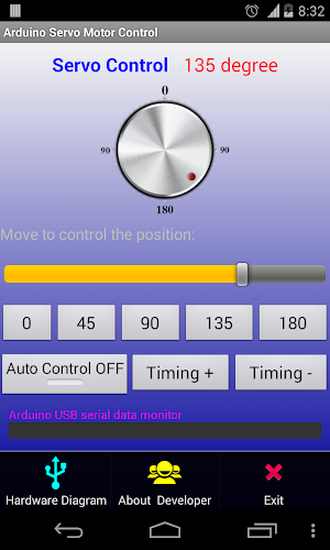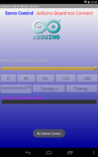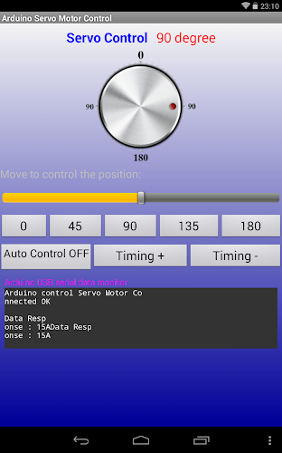 Aplikace ovládání servo motoru Arduino USB je umožňuje ovládat polohu motoru servomotoru (0- 180 stupňů)Tato aplikace se musí připojit k Arduino s USB-OTG a pak ovládací servo motor. output)