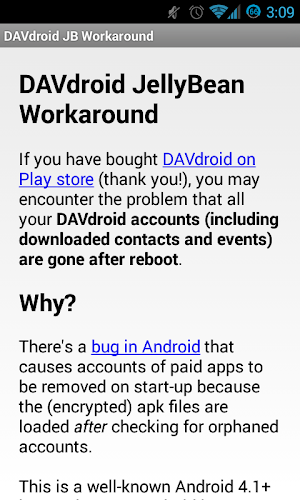 V Android jsou chyby (https://code.google.com/p/android/issues/detail?id=34880 a http://code.google.com/p/android/issues/ detail? id = 66905), který způsobuje, že účty placených aplikací jsou odstraněny při spuštění nebo při aplikaci appdate (o známé se na zařízeních Nexus a Motorola Moto s Androidem 4.4.2), protože (šifrované) soubory APK jsou načteny poté kontrola osiřelých účtů. Jedná se o známou chybu Android 4.1+ a ne davdroid chyba