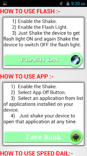 This app is created to help users to open any application very fast, just by shaking your mobile.In the app Setting page you can Enable or Disable the app features.This app has 3 Awesome Features:-1) Shake your mobile to Switch on Flash Light. ...