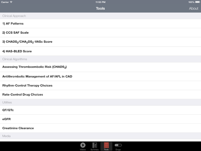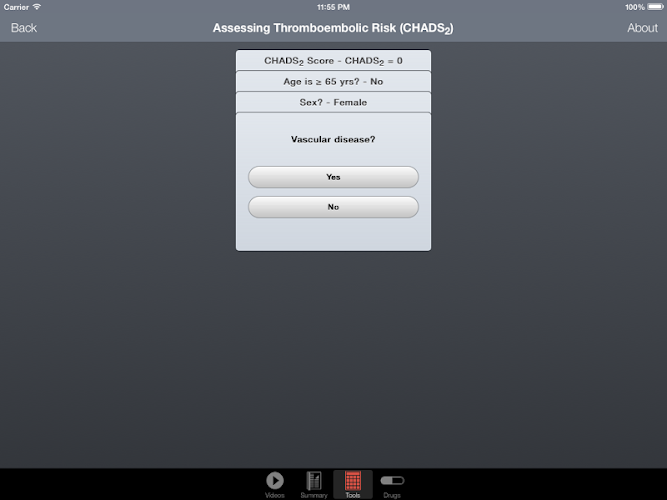 • nástroje včetně: chads2/chads-vasc skóre pro hodnocení rizika cévní mozkové příhody, has-bleed skóre pro hodnocení rizika krvácení, stupnice ccs závažnosti fibrilace síní (saf), kalkulačka qt/qtc, kalkulačka renálních funkcí (např. fr, crcl)