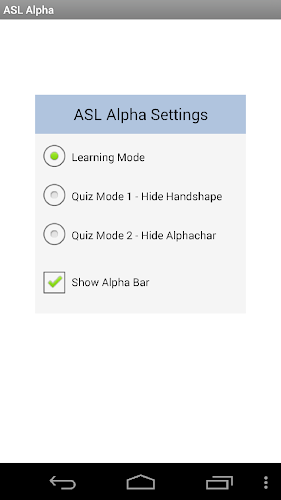 asl alpha vám pomůže naučit se asl (americký znakový jazyk), pravopisná čísla prstů (1 – 10) a abecedu.v režimu učení se zobrazuje jak tvar ruky asl, tak odpovídající číslo nebo písmeno. můžete krokovat vpřed nebo vzad v abecedě pomocí tlačítek předchozí nebo následující nebo stisknutím jednoho z tlačítek na panelu alfa. vyberte náhodně, chcete-li zobrazit další náhodně vybrané číslo nebo písmeno.