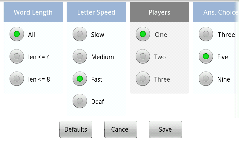 existuje nastavení pro změnu rychlosti pravopisu prstem, délky slova, počtu možností odpovědí a počtu hráčů (pouze verze plus, až 3 hráči).