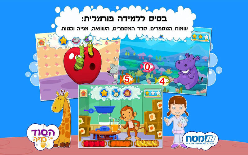 הסוד של מיה - משחקים ללימוד חשבון ומספרים מבית מטח המיועדים לילדים בגיל הרך.בואו ללמוד עם מיה, מטר ושאר החברים מספרים וחשבון בצורה משעשעת, כיפית וחוויתית.