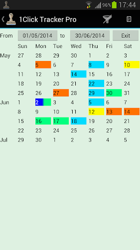 Zaznamenejte své důležité události jedním kliknutím, první tři z zásuvky oznámení. Poté je uvidíte v kalendáři, vyhodnotíte je grafy a exportujte je e -mailem pomocí PDF. Pro zobrazení kalendáře lze v nastavení aktivovat statistiky za den. Je možné zadat nekonečné množství událostí a pro každou z nich lze zvolit barvu. S barvami lze události snadno rozlišit v kalendáři a grafy. x- přehrávání hudebního nástroje X