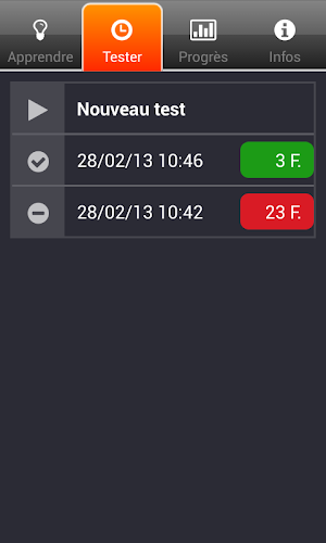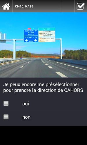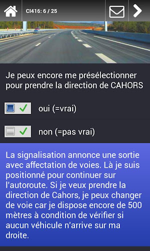 V testovacím režimu můžete zkoušku vykonávat za skutečných podmínek. Stejně jako ve službě automobilů, test sestává z náhodně vybraných otázek s omezeným časem, aby je odpověděli přesně jako D -den. Po testu zjistíte, zda jste uspěli, otázky, na které jste neodpověděli špatně a co by byla správná odpověď.