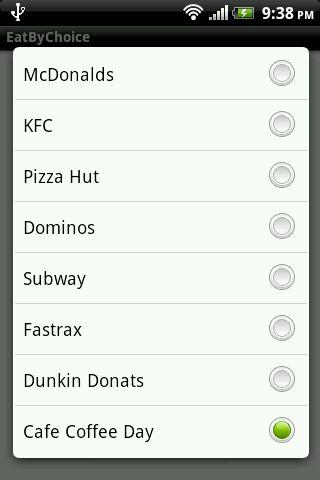 EatBychoice je snadná a dva z jedné aplikace, která poskytuje uživateli jednoduchý zážitek pro procházení nabídek a umístění franšízy hlavních občerstvení v Indii. #}- Najděte své nejbližší otevřené McDonald's, KFC, Pizza Hut, Domino's, Subway, Cafe Coffee Day, Dunkin Donuts, Fastrax. Dunkin Donuts, Fastrax v Indii.MENU (Internet není nutný)