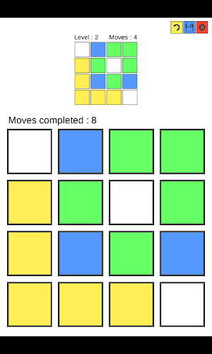 Kachlová je logická hra! Musíte klepnout na dlaždice, aby odpovídaly vzoru generovaném aplikací. Klepnutím na jednu dlaždici způsobuje kaskádový účinek; Jinými slovy, spouští se kolem něj dlaždice! Pokud se ztratíte, můžete přehrát obrazovku kliknutím na ikonu nabídky v pravém horním rohu obrazovky a poté kliknutím na tlačítko „Reseset“2) Klikněte na své dlaždice, ale pokaždé, když klepnete na dlaždice, změníte kolem ní dlaždice. Nezapomeňte sledovat, kam kliknete, je snadné se ztratit !!
