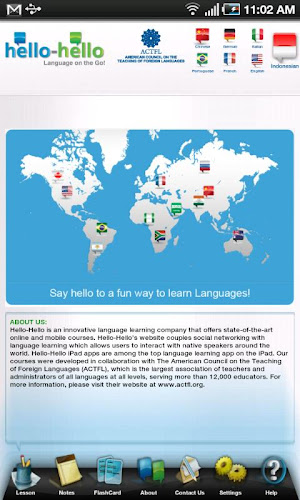 hello-hello je inovativní společnost pro výuku jazyků na mobilu, která nabízí nejmodernější a nejmodernější online kurzy. Web hello-hello.com spojuje sociální sítě s výukou jazyků, což uživatelům umožňuje komunikovat s rodilými mluvčími z celého světa. Aplikace hello-hello pro ipad patří mezi nejlepší aplikace pro výuku jazyků na ipadu. naše konverzační kurzy byly vyvinuty ve spolupráci s americkou radou pro výuku cizích jazyků (actfl), která je největším sdružením učitelů a administrátorů všech jazyků na všech úrovních a slouží více než 12 000 pedagogů. pro více informací prosím navštivte jejich web na www.actfl.org.