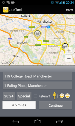 aplikace „justaxi“ je k dispozici pro použití ve velkém Manchesteru ve Spojeném království.