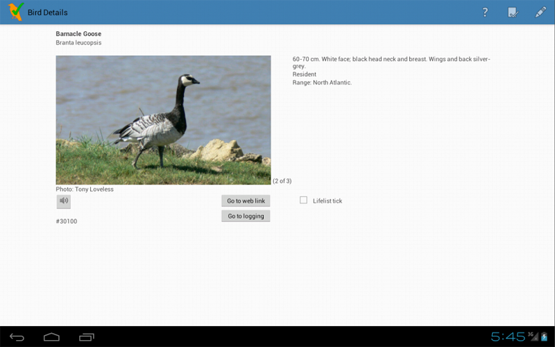 Toto je jedna z řady aplikací Birding Controllist pro mobilní telefony a tablety Android. Existují žádosti o Austrálii, Nový Zéland, Spojené státy (s výjimkou Mexika a Jižní Ameriky), Western Palearctic (Velká Británie a Evropa), Pacific Islands, Jižní Afrika a Ekvádor/Peru/Bolivia. Zkontrolujte prosím soubor README na tomto webu ke stažení, abyste věděli, jak to udělat. Fotografie a zvuky nejsou zahrnuty do balíčku stahování z trhu Android. Web: