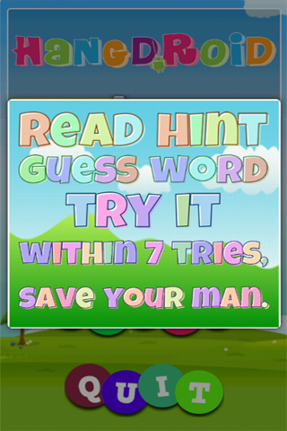 Hangdroid je další vzrušující hra od Aabasoftu, která je inspirována slavným hangmanem Word Game. :)Jste to určitě milujete !!