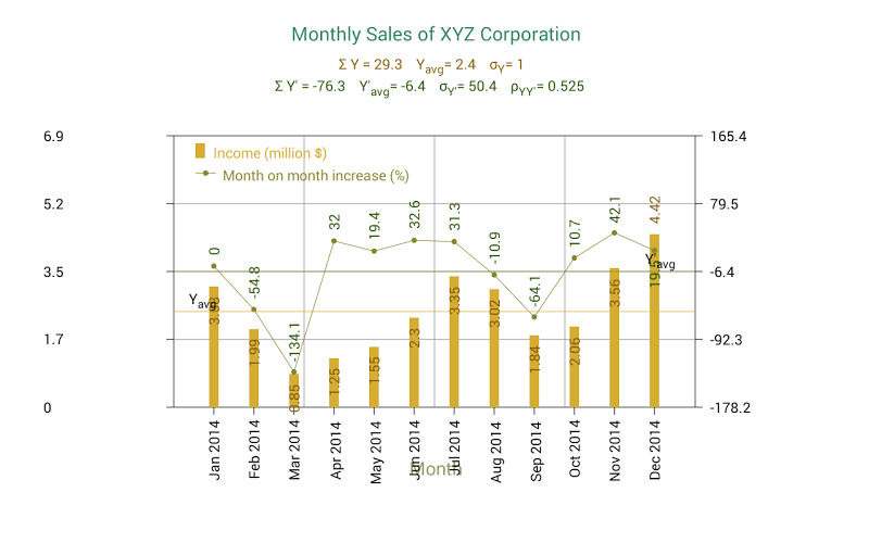 Můžete také porovnat svá data s jinou sadou. Například můžete porovnat skutečný prodej různých produktů ve čtvrtině s předepsaným cílem pro stejný čtvrtletí. To je nutné, pokud jsou dvě sady y-dat v různých povaze nebo mají odlišný rozsah hodnot. Například účinnost propagační kampaně o prodeji produktu může být studována vynesením prodejních údajů různých prodejních pracovníků před kampaní pomocí původní osy Y a vynesením procentního zvýšení nebo snížení odpovídajícího prodeje po kampani pomocí sekundární osy Y.