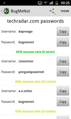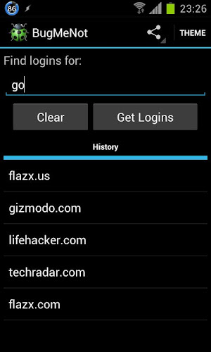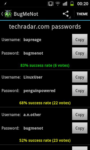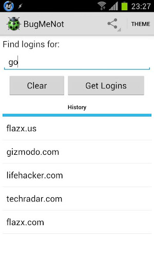 Pokud aplikace spadne, když spustíte, zkuste ji odinstalovat a znovu nainstalovat z obchodu PlayBugMenot pro Android je Android aplikace pro www.bugmenot.com, která vám umožňuje rychle obejít přihlášení webových stránek, které je vyžadováno instrukce: {{{