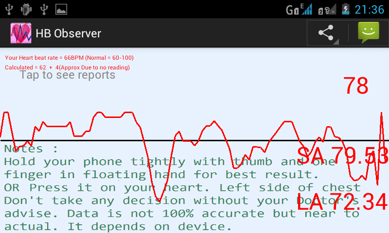 Observer rychlosti srdečního rytmu je nová aplikace pro měření a monitorujte rychlost rytmu srdce. Výsledkem je BPM pomocí interních senzorů smartphonu. Zobrazuje také živý graf na obrazovce. Jeho výpočet založený na složité matematice a statistické analýze. Aplikace Heart Beat Monitor převádí váš telefon a připraven k použití lékařského nástroje. Můžete jej snadno používat kdekoli a kdykoli. Vymyslel jsem algoritmus pro výpočet této inovativní aplikace.Můžete použít pulzní frekvenci pro kontrolu své aktivity, nemoci, kondice, nálady, zdraví atd. Můžete ji měřit v různých časech pro poznání a zlepšení vaší efektivity. Nebo jej můžete použít pro zábavu kdykoli.