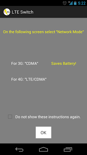 Tato aplikace je pro Samsung Galaxy Nexus LTE na Android 4.x, ale může pracovat s jinými zařízeními CDMA (zejména US Cellular and Sprint telefony).Pokud se váš telefon LTE snaží udržet výdrž baterie, tato aplikace je pro vás. Celodenní výdrž baterie je obvykle mnohem důležitější než rychlost LTE a většinu každodenních telefonních úkolů nevyžadují rychlosti nad 3G. Tato aplikace vám umožní snadno a pohodlně přepínat mezi 3G a 4G LTE, aniž byste museli vyvrtat prostřednictvím nabídek pro více nastavení. Uvidíte lepší výdrž baterie, pokud tuto aplikaci použijete k zapnutí LTE, pouze pokud ji potřebujete.