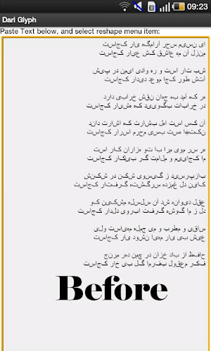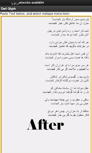 Aplikace pro zobrazení textů v arabštině, perštině, farsi, urdu jazycích.V Android není možné zobrazit farsi, dari, perské nebo arabské dopisy, dobře je to možné, ale nejsou formovány správně. Použijte tuto aplikaci k jejich přetvoření.
