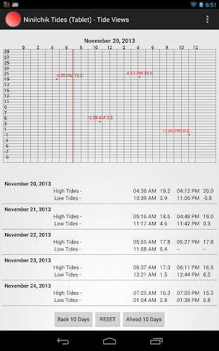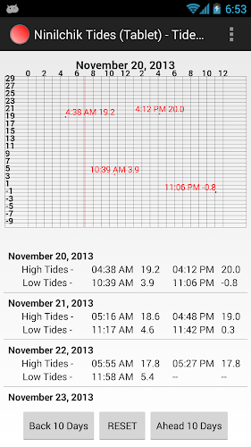 přílivové tabulky pro ninilčik, aljaška.aplikace přílivová tabulka pro ninilčik na aljašce, která zobrazuje příliv a odliv v 10denním seznamu a v grafu.
