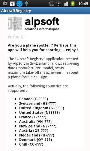 Are you a plane spotter ? Perhaps this app will help you for spotting ... enjoy !The "Aircraft Registry" application created by AlpSoft in Switzerland, allows retrieving data (manufacturer, model, seats, maximum take-off mass, owner, ...) about a plane from a call sign.