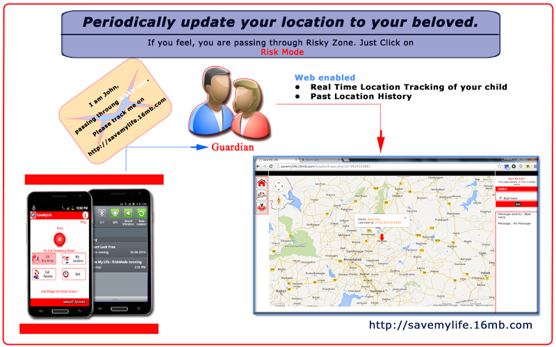 1. rizikový režim:- pokud máte pocit, že jste v nebezpečí, pouhým stisknutím tlačítka „v rizikovém režimu“ obdrží předdefinovaný opatrovník SMS s webovým odkazem, který ukazuje vaši polohu v reálném čase.