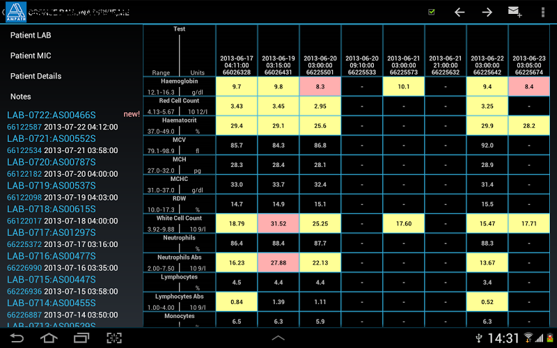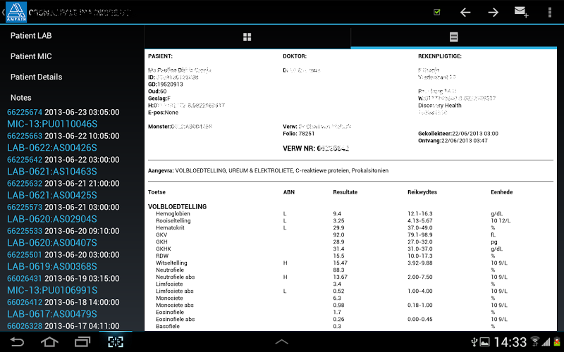 Poskytování laboratorních výsledků do lékařského zařízení Android.