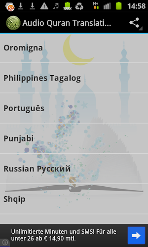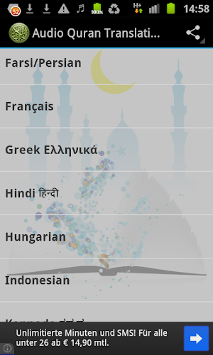 Tato aplikace je vaším jedinečným mobilním zdrojem pro vysoce kvalitní překlady MP3 významů Koránu v různých jazycích prostřednictvím online rozhlasových stanic. Vyberte si z více než 30 jazyků, jako je angličtina, Français, Deutsch, Español, руский a mnoho dalších. Jazyk!Toto je bezplatná aplikace podporovaná reklamou, ale bez jakýchkoli nepříjemných reklam!
