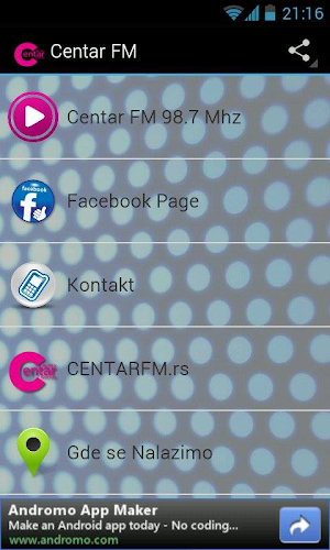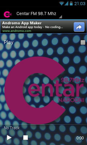 Analýza A Revize Aplikací Pro Android: CentarFM, Vyvinuté Společností Click Internet Solutions. Uvedeno V Kategorii Hudba A Zvuk. Aktuální Verze Je 1.0, Aktualizována Na 11/06/2014 . Podle Recenzí Uživatelů Na Google Play: CentarFM. Dosaženo Více Než 500 Instalací. CentarFM Má V Současné Době Recenze 21, Průměrné Hodnocení 4.9 Hvězd