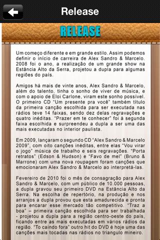 Mladé country duo Alex Sandro a Marcelo je novým zjevením country hudby. požadavky přetékají. spojující talent, charisma a hudební kvalitu - s pětiletou kariérou, dvěma CD a DVD - si již vydobyl své místo na trhu. Sen živit se hudbou a předávat emoce, které cítí, svým fanouškům, se stal skutečností. Na nedávno vydaném CD Diamond je píseň „Pra Não Me Repent“, která obsahuje Marcose a Beluttiho, již jednou z nejhranějších v některých oblastech země a video k „A Louda da Balada“ je jedním z nejsledovanějších.Prostřednictvím této aplikace můžete mít aktuální informace o naší agendě, diskografii, sociálních sítích a mnohem více...