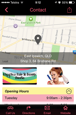 Giggles Hair and Beauty Studio se nachází v Ipswich, Qld. Jsme funky, elegantní studio plné profesionálních kreativních stylistů a terapeutů. Nejen, že necháte pocit a vypadáte jako milion dolarů, ale užijete si skvělý rozhovor nad lahodným cappuccino s několika chichotáními.Stáhněte si naši bezplatnou aplikaci a přečtěte si více o nás a našich službách. Můžete také provádět rezervace nebo dotazy, nárokovat si odměny za věrnostní, číst a nechat recenze, prohlížet si obrázky obrázků, poslat nám fotografii pro naše galerie, sledovat naše nejnovější zájmy a zapojit se s našimi sociálními médii, jako je Facebook. Recenze