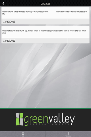 • Push Notification Messaging - receive messages containing important church information while on the go.