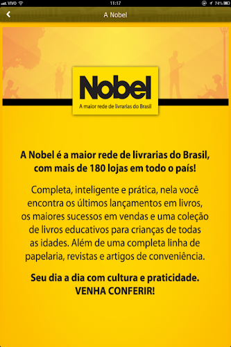 Nobel je největší řetězec knihkupectví v Brazílii se 180 obchody po celé zemi! Najdete zde nejnovější knižní vydání, největší prodejní úspěchy, ale i papírenské zboží, časopisy, dětské knížky a potřeby.S aplikací Nobel je mnohem snazší najít nejbližší obchod, být součástí věrnostního klubu a také zůstat v obraze o akcích, aktivitách a hlavních výhodách.