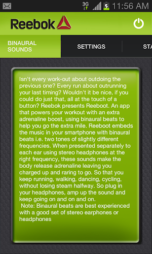 není každý trénink o překonání toho předchozího? každý běh o předběhnutí svého posledního načasování? nebylo by hezké, kdybyste to dokázali, a to vše stisknutím tlačítka? Reebok představuje reebbota. aplikace, která dodá vašemu tréninku další adrenalinovou dávku a využívá binaurální rytmy, které vám pomohou udělat další míli.reeboot vloží hudbu do vašeho smartphonu pomocí binaurálních rytmů, tj. dvou tónů s mírně odlišnými frekvencemi. Když jsou tyto zvuky předkládány každému uchu samostatně pomocí stereo sluchátek se správnou frekvencí, přiměje tělo uvolnit adrenalin a vy budete nabití a budete moci jít. abyste mohli běhat, chodit, tancovat, jezdit na kole, aniž byste v polovině ztráceli páru.