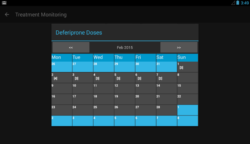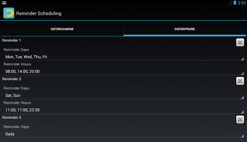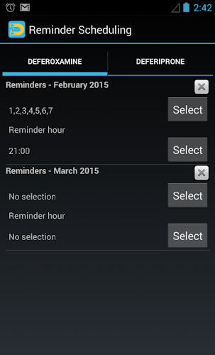 2. Plánování připomenutí dávky pro každý typ léku. Uživatel může buď naplánovat injekce deferoxaminu měsíčně, dávky deferipronu na týdenní bázi nebo jejich kombinaci. Aktivovaná připomenutí se zobrazují jako oznámení o smartphonu, která přimějí uživatele, aby potvrdil příjem, opomenutí nebo odložení dávky